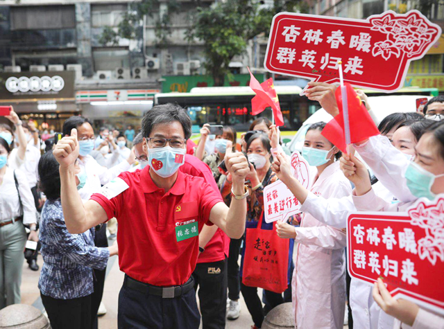 图为广东省中医院医务人员代表欢迎第二批国家援助湖北中医医疗队队长、广东省中医院副院长张忠德等休整结束返院。 李细华/摄